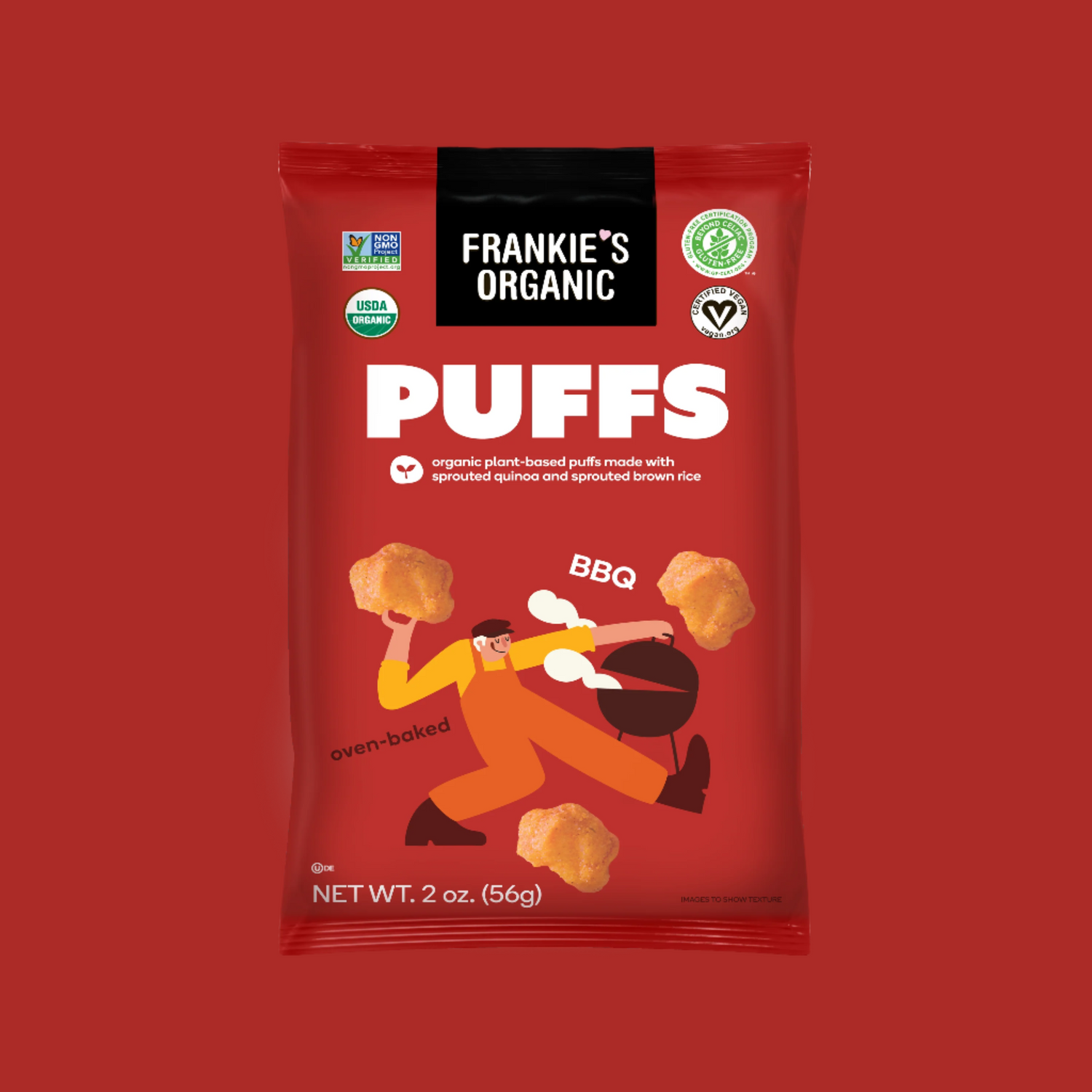 Frankie's Organic BBQ Puffs have a big, bold taste. They're light, crunchy and irresistibly delicious with real BBQ flavor! Have them as a snack— or finish off the whole bag. These guilt-free puffs are made with good-for-you ingredients like sprouted quinoa and sprouted brown rice. They're also certified gluten-free and vegan without compromising on flavor, making them the perfect snack for everyone. Grab & Go format, a perfect single serving size for your everyday snacking needs.