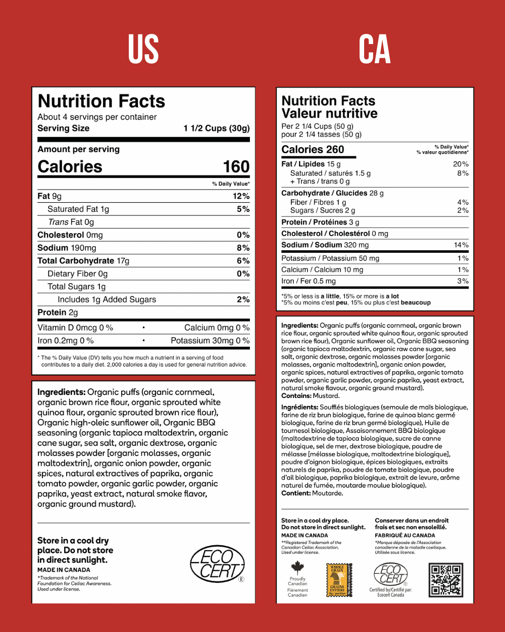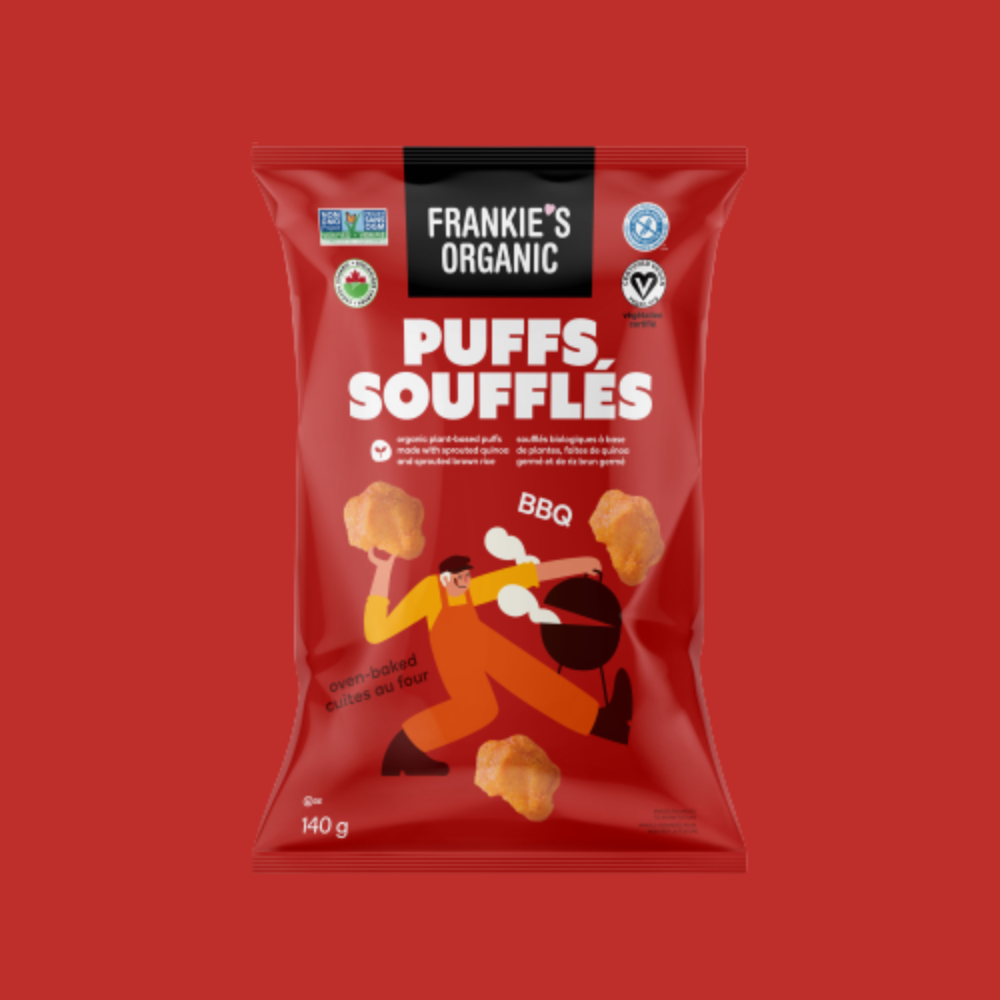 Frankie's Organic BBQ puffs have a big, bold taste. They're light, crunchy and irresistibly delicious with real BBQ flavour! Have them as a snack— or finish off the whole bag. These guilt-free puffs are made with good-for-you ingredients like sprouted quinoa and sprouted brown rice. They're also certified gluten-free and vegan without compromising on flavour, making them the perfect snack for everyone.