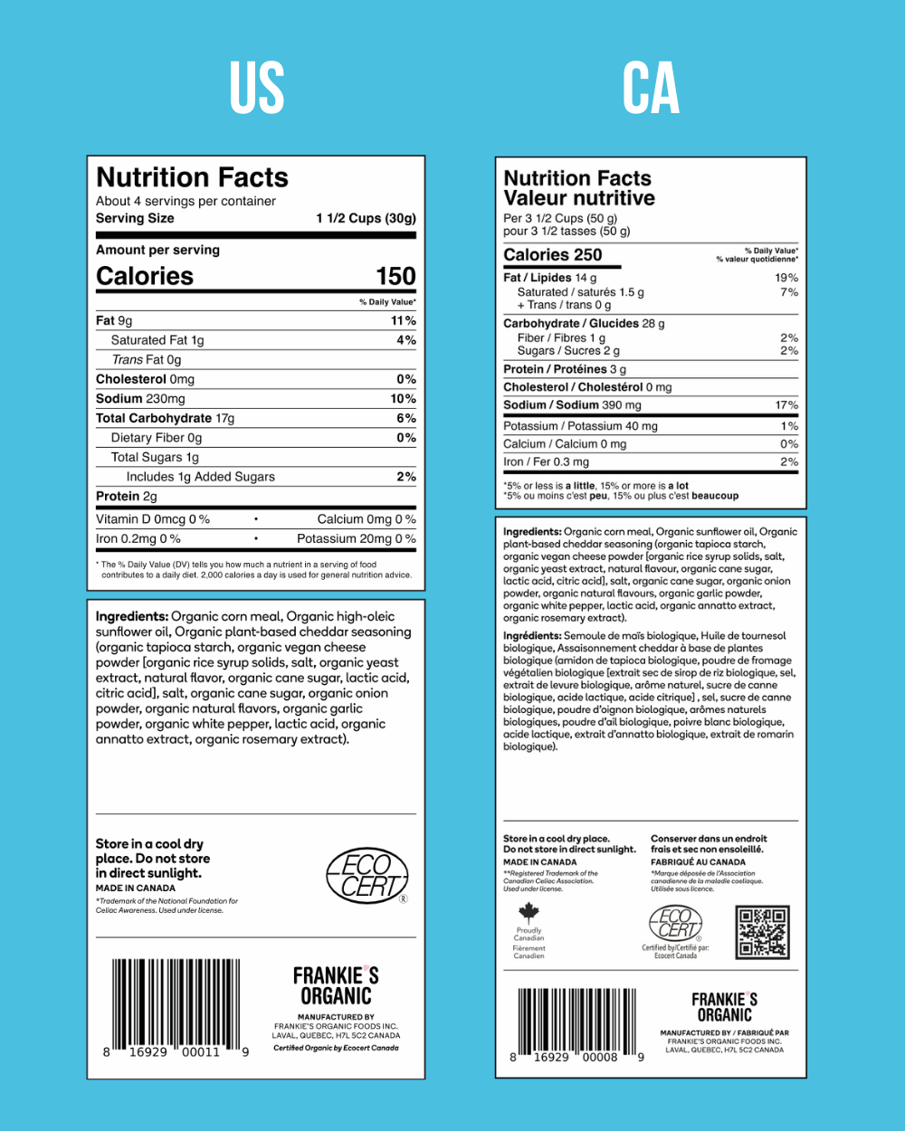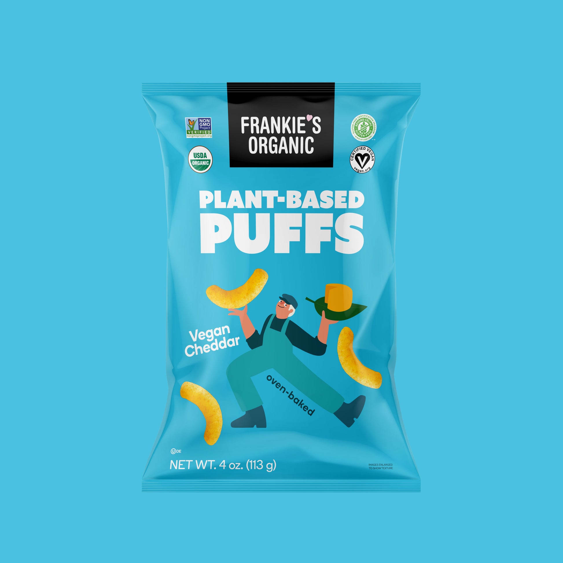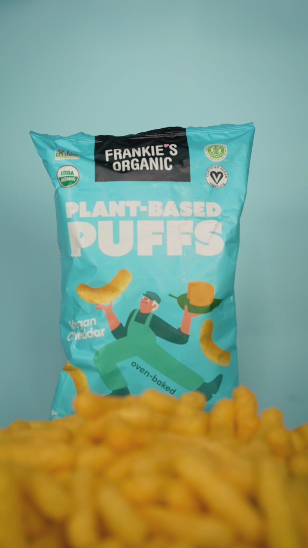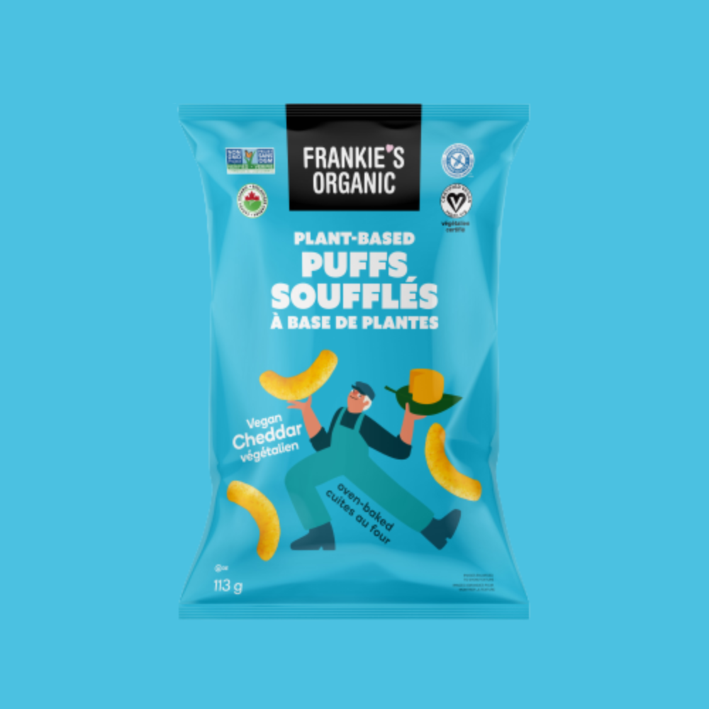 Frankie's Organic Vegan Cheddar puffs have a bold, cheesy taste. They're light, crunchy and irresistibly delicious with a sharp cheddar flavour! Have them as a snack — or finish off the whole bag. These guilt-free puffs are made with good-for-you ingredients like organic cornmeal. They're also certified gluten-free and vegan without compromising on flavour, making them the perfect snack for everyone.